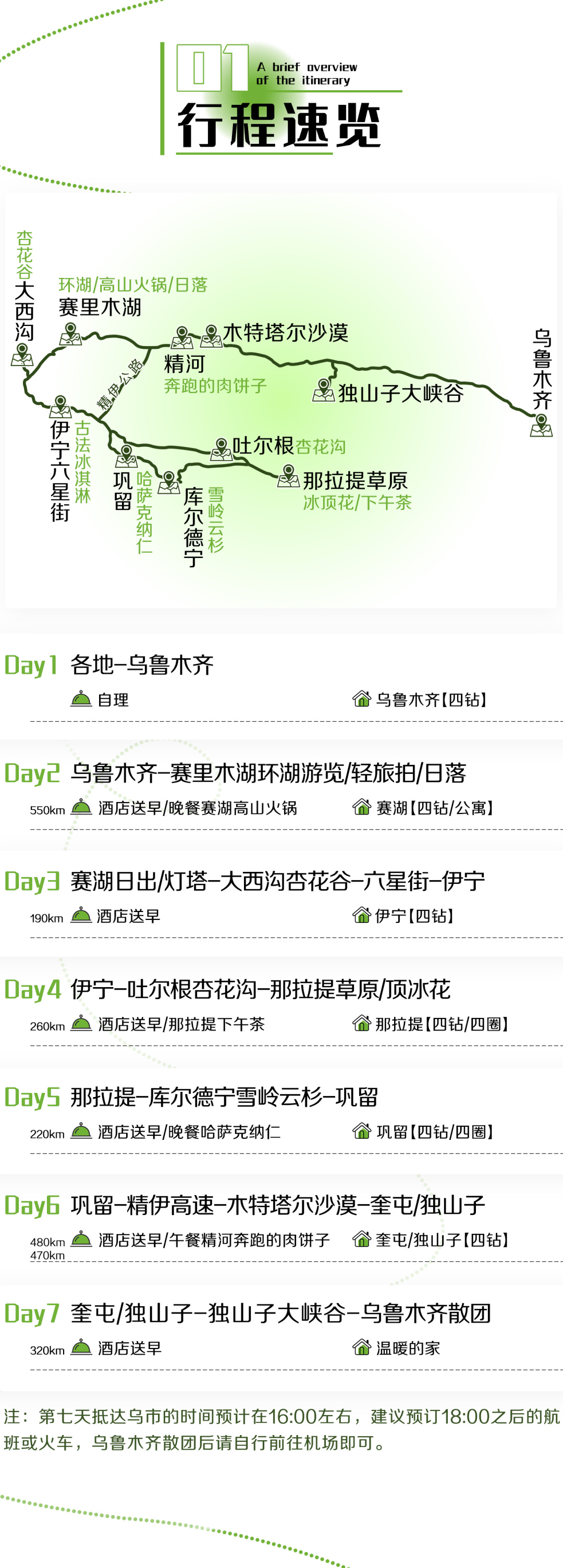 3. 赠送集合日当天免费接机/接站服务(2人起赠送,提前抵达者请自行前往酒店)。请提前至少3天告知航班/车次信息,如未告知,视为自动放弃。默认安排拼车(1小时内),如您不想等待,可自行打车或搭乘地铁前往酒店(费用自理)。抵达乌鲁木齐机场/火车站后,请主动联系接机人员确认上车位置,如出现等候的情况,请给予谅解。不含送机及送站服务,送机(站)服务:5座车100元/辆、7座车200元/辆,如需要请提前至少1天告知工作人员。