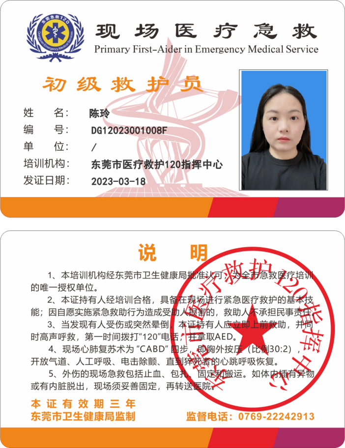 2023年,参加东莞市红十字会救护员培训,获得初级救护证。